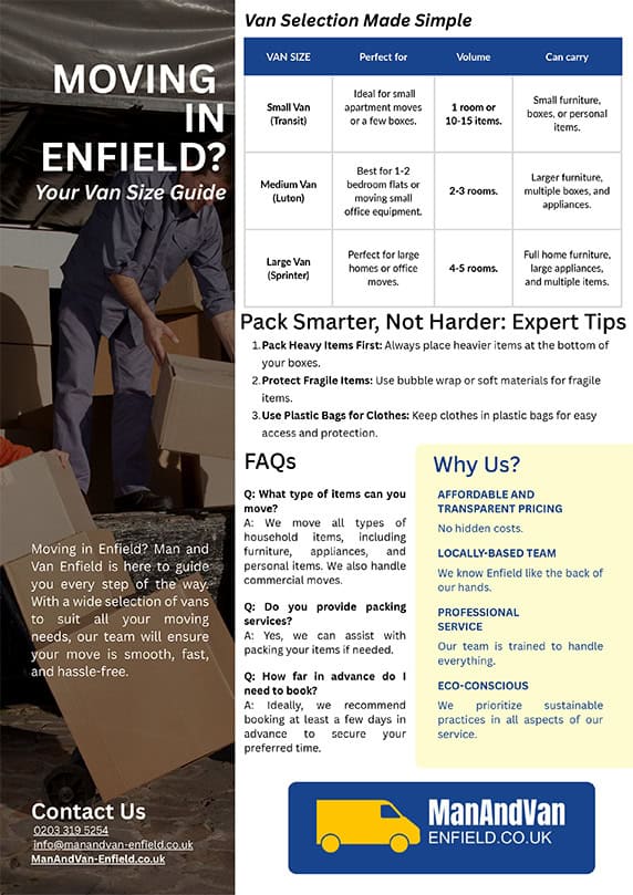 Our wide range of man and van removals services ensures we can handle any move, regardless of van size. Book your man and van with us today and get an instant man and van quote. See why we are the trusted choice for so many in Enfield and experience our efficient and professional, quality man and van services from a dependable moving company.